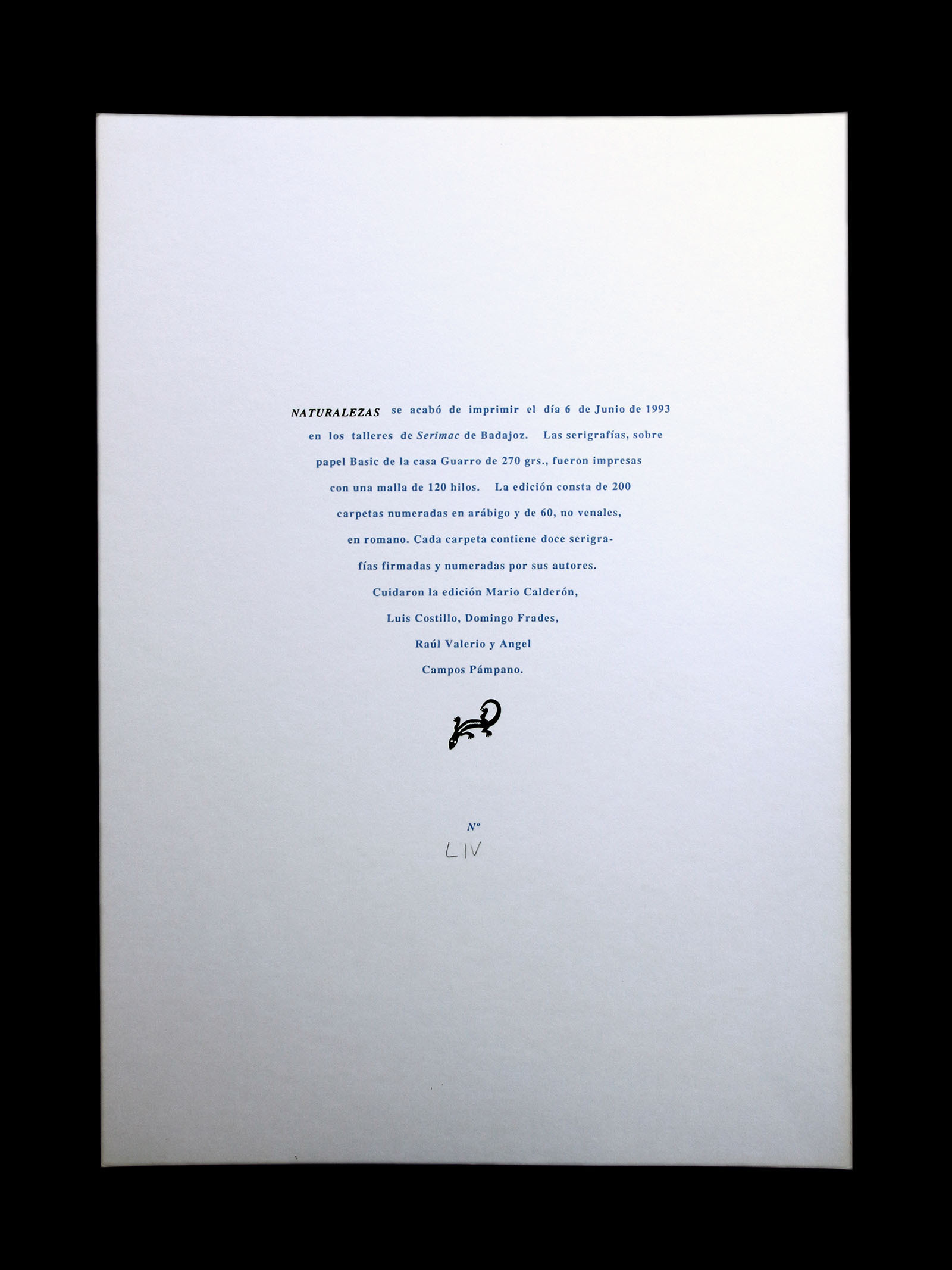 12 serigrafías a varias tintas sobre papel Basik Guarro impresos en Serimac (Badajoz); firmadas y numeradas por sus autores.