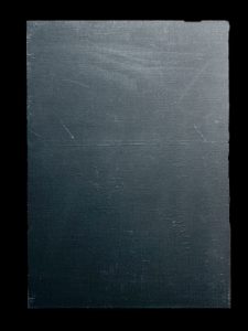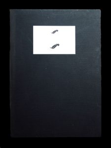Caja realizada en c/c cubierto de telflex negro y madera; texto serigrafiado sobre papel adhesivo blanco en cubierta; 54,5 x 39 x 2,6 cm.