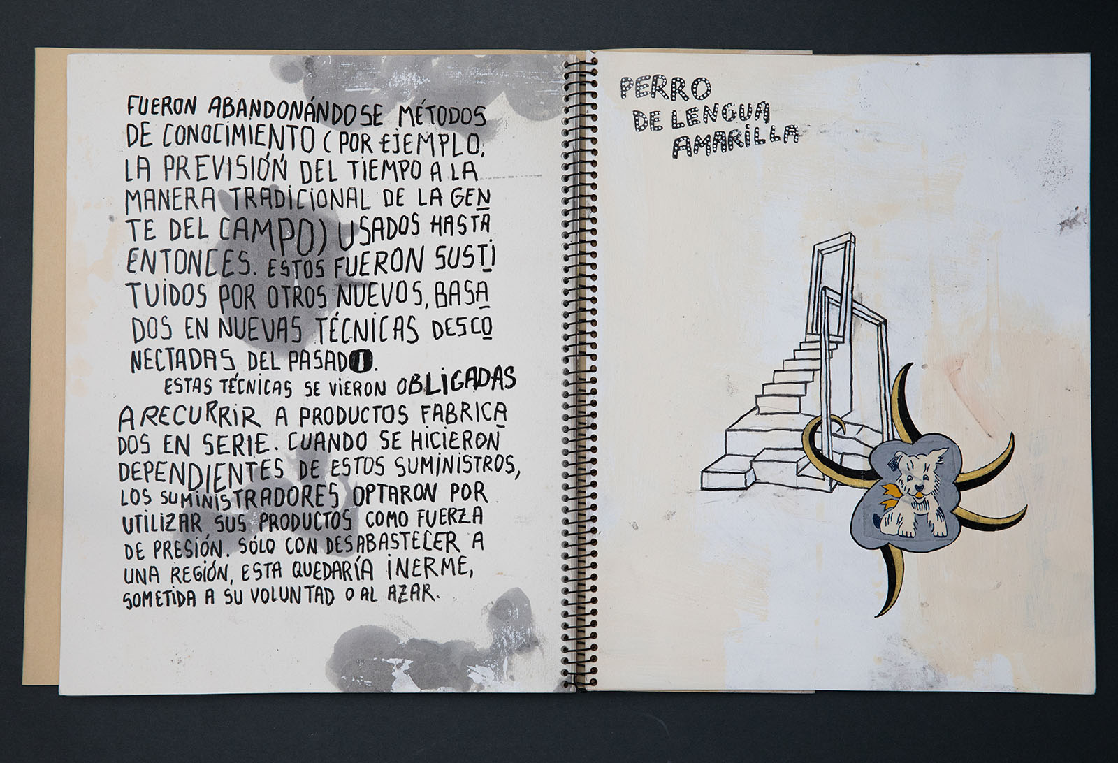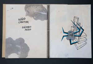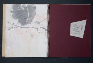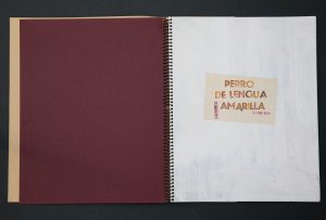 Portada con texto rotulado en t.c., sello FH, sello de fechas sobre papel pautado adhesivado, acrílico y óleo sobre papel Súper Alfa de Guarro crema; colofón con texto mecanografiado y sello FH, fechado, en papel pautado adhesivado sobre cartulina granate.